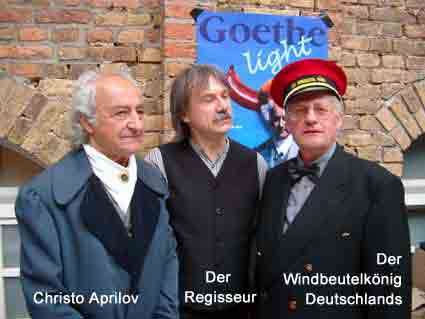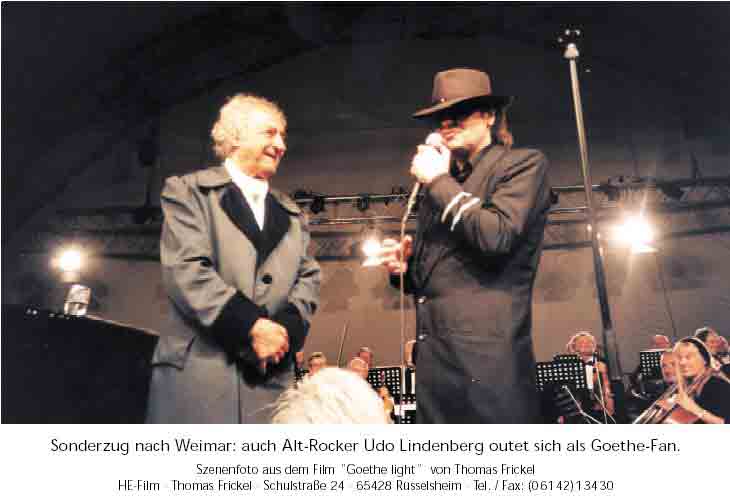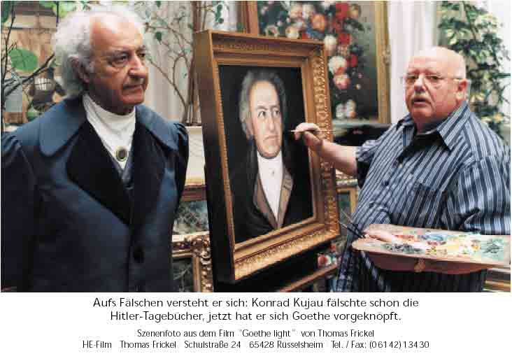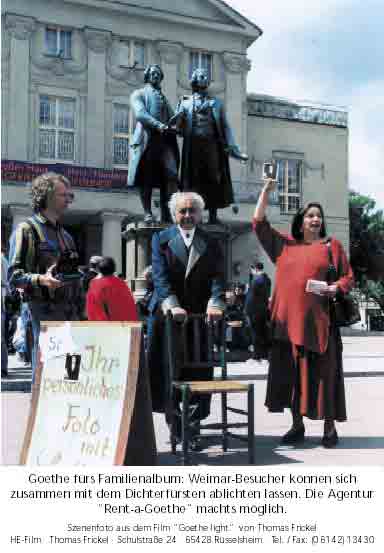 beteiligt. Der bulgarische Goethe des Films spricht kaum ein Wort deutsch und kennt sich nicht in Goethes Werken aus. Per Funk und mit Erich als Sprecher rezitiert er "Über allen Gipfeln ist Ruh'". Unmöglich, so ein Goethe, möchte man meinen. Nein, umgekehrt: es ist dies die einzige Möglichkeit, dem Kultur-Konsumenten von heute den Dichter Goethe anzudienen. Ein alter Goethe ohne Sprache, ohne Werk, ohne künstlerisch-politisches Anliegen und - Goethe der Dialektiker! - ohne Entwicklung, gerade das ist die Voraussetzung erfolgreicher Vermarktung des Dichters in der Spaßgesellschaft. Ein gravitätisch daherschreitender Gehrock, wie geklont, stumm und marionettenhaft fremdgesteuert, das ist zweifellos "unser Goethe". Instrumentalisiert wurde der Dichter in Deutschland schon immer, gewechselt hat das "wofür". Umgelogen und ungebogen wurde er, seit er Weltruhm erlangte. Neu ist dies: "Unser" heutiger Goethe ist "entkernt", er kann jedes fremde Wesen, je nach Marktnotwendigkeit, gleichzeitig annehmen.