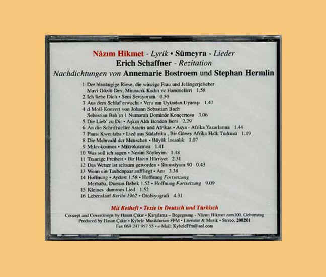Die CD enthält folgende Gedichte bzw. Lieder: 1. Der blauäugige Riese, die winzige Frau und Jelängerjelieber 2. Ich liebe Dich 3. Aus dem Schlaf erwacht 4. d-Moll-Konzert von Johann Sebastian Bach 5. Die Lieb zu Dir 6. An die Schriftsteller Asiens und Afrikas. 7. Pansi Kwentaba Lied aus Südafrika 8. Die Mehrzahl der Menschen 9. Mikrokosmos 10. Was soll ich sagen 11. Traurige Freiheit 12. Das Wetter ist seltsam geworden 13. Wenn ein Taubenpaar auffliegt 14. Hoffnung /Aydost/ Hoffnung/ Merhaba, Dursun Bebek/ Hoffnung 15. Kleines dummes Lied 16. Lebenslauf, Berlin 1962